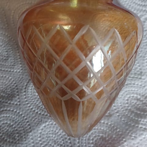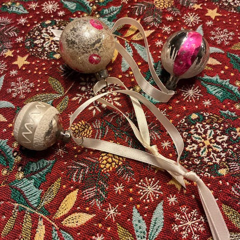 Smukke kugler i meget tyndt glas med sne og fineste relief. De er begge med hakker i halsen men kan stadig fint hænge på træet.