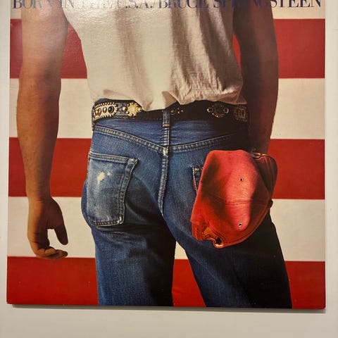 Bruce Springsteen Born in the U.S.A. vinylplade med original cover og indersleeve. Pladen er en LP med CBS label, indeholder flere sange fra albummet. Coveret viser en mand med jeans og en rød hat mod en amerikansk flagbaggrund.
