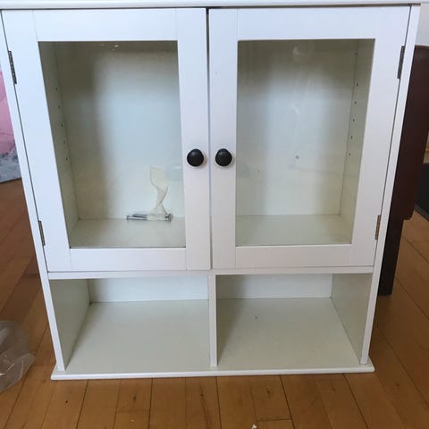 Lille fint pibeskab med grøn glaslåge og hylde med huller til piber. Hylderne sidder ikke fast og kan således omrangeres. Jeg har brugt skabet som barskab.