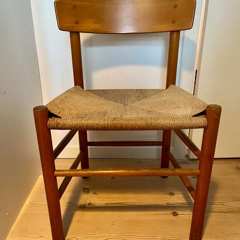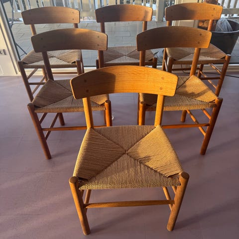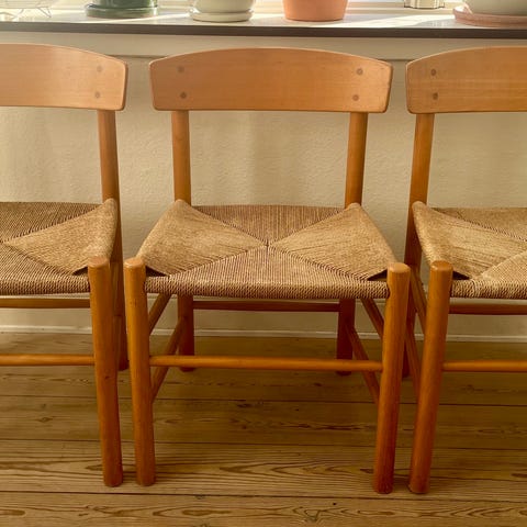 5 stk. fine folkestole i eg med intakt flet og med den rette patina. Der medfølger 1 stk, som er revnet (se billede), men som kan fungere som pyntestol rundt om spisebordet :)