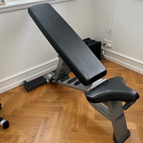 Træningsbænk med vægtstangholder i sort farve. Bænken kan justeres og foldes for nem opbevaring. Designet til styrketræning og vægtløftning med plads til vægtstang.