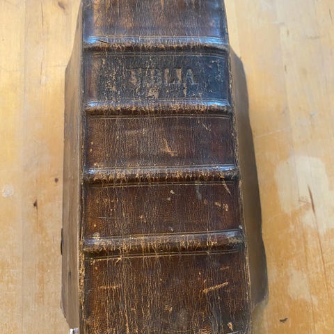 Sagrada Biblia bog med sort omslag og røde detaljer på forsiden og ryggen.