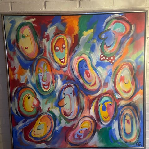 Abstrakte malerier med forskellige motiver og farvetemaer. Indeholder billeder af figurer, blomster, kop og kande, samt bylandskab. Malerierne er indrammede og varierer i farve og stil.( Anni Grøndahl, det blå maleri med ansigter er vurderet til 1500,-)