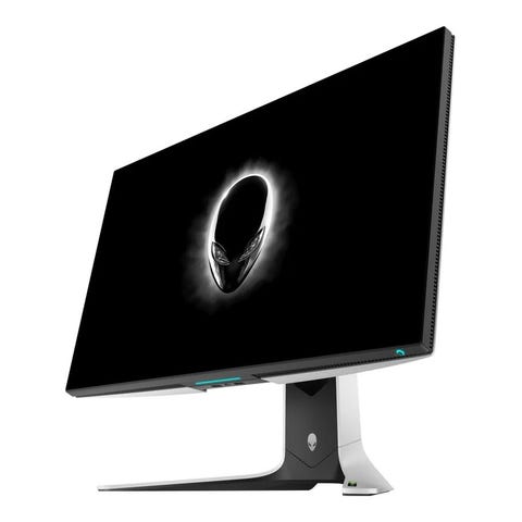 Alienware 27" skærm med hvidt kabinet og sort skærmramme. Skærmen har en størrelse på 27 tommer, egnet til gaming og professionel brug.