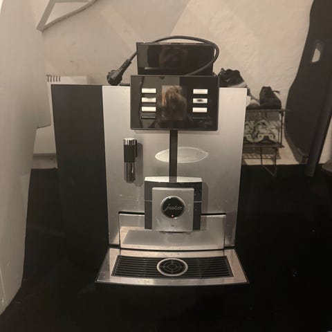 Jura GIGA 5 espressomaskine i krom. Maskinen har dobbelt bryggehoved, integreret mælkeskummer og en brugervenlig kontrolpanel med drejeknap. Designet til at brygge flere kopper kaffe samtidigt, egnet til både hjemme- og kontorbrug.