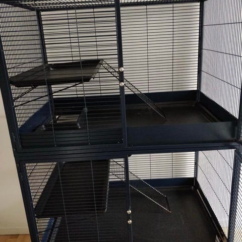 Savic Freddy tamrottebur med brungrå base og metalgitter. Buret inkluderer platforme, rampe, madskål, hjørnetoilet, huler og vandflaske. Passer til små kæledyr som tamrotter. Bundstrøelse og mad medfølger.
