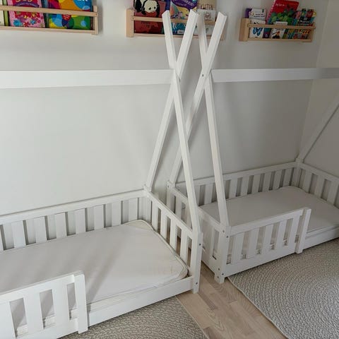 Done by Deer børneseng. Kan enten fungere med sengehest eller tremmeside. Inkl. madras, lagen og sengerand. Enkelte små brugsspor (se foto). Afhentes i Hvidovre. Sengen er samlet ved afhentning.