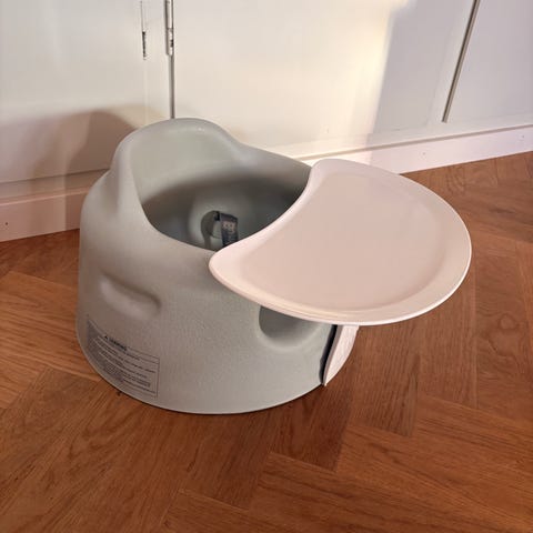 Barnesæde fra Bumbo i grå, der kan spændes fast til de fleste almindelige spisebordsstole. Sædet er helt nyt, da vi aldrig fik det brugt.