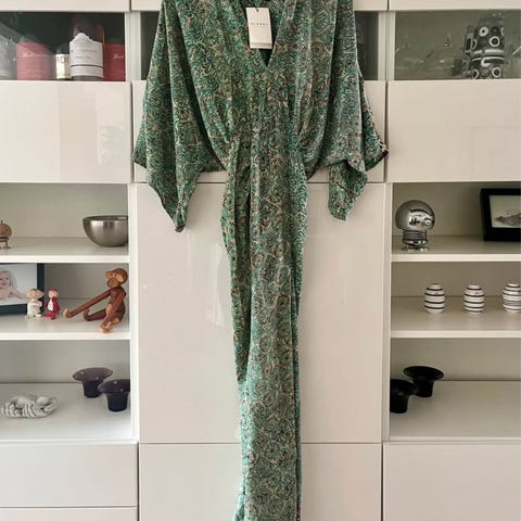 Den er en smuk kimono-inspireret kjole med brede ærmer og drapering i taljen, som giver en flot silhouette. Kombinationen af afslappet pasform og eksotisk dramatik gør at denne one of a kind-kjole kan bruges til enhver lejlighed.
