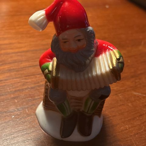 Retro porcelæns nisse -pige, med harmonika, strik-hue og hår, 12 cm høj