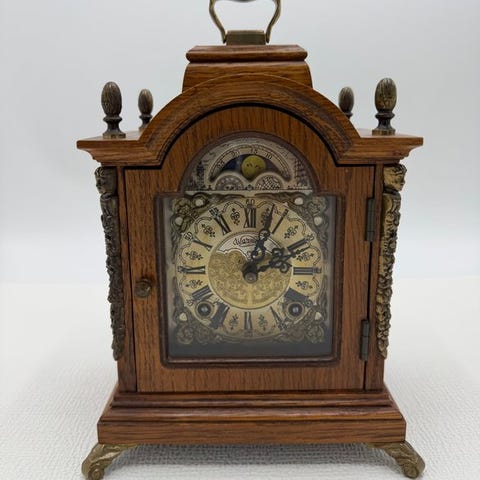 Gammelt træklokke af træ med månfaser og Westminster-slåning, mekanisk urværk med langvarig kraftreserve, fra 1960–1970, i funktion, med optræksnøgle, mål 38 × 25 × 18 cm, Made in Germany. Klik på den blå "gå til varen" knap, for at købe eller byde på denne vare. Den samlede pris vil blive vist inden du afgiver dit bud.