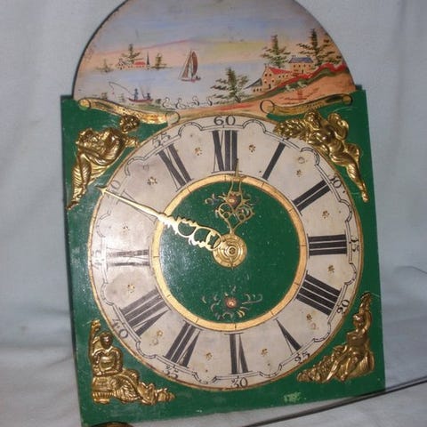 De håndmalede urskive viser til venstre for maansymbolen en mølle med hus, og til højre en kirke med et hus. Mellem dem er der endnu et hus og to både på vandet. I