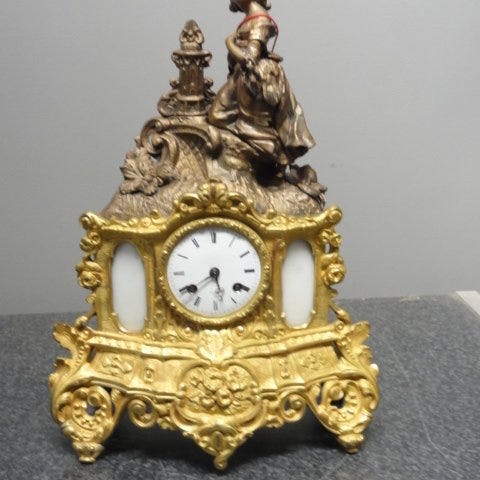 Fransk mantelur bronzer, figurfremstillet ur med mekanisk 8-dages værk, dateret 1850–1900, kaldet 'The Noble Gardner', mål 40 × 30 × 10 cm, vægt 5 kg, med optræksnøgle, slår halvanden time på en klokke og er i god drift. Klik på den blå "gå til varen" knap, for at købe eller byde på denne vare. Den samlede pris vil blive vist inden du afgiver dit bud.