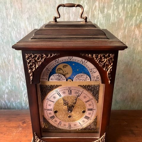 Træ mantelur fra 1950–1960 med mekanisk bevægelse og Westminster slagværk med fem klokkeslag, fremstillet i Tyskland. Klik på den blå "gå til varen" knap, for at købe eller byde på denne vare. Den samlede pris vil blive vist inden du afgiver dit bud.