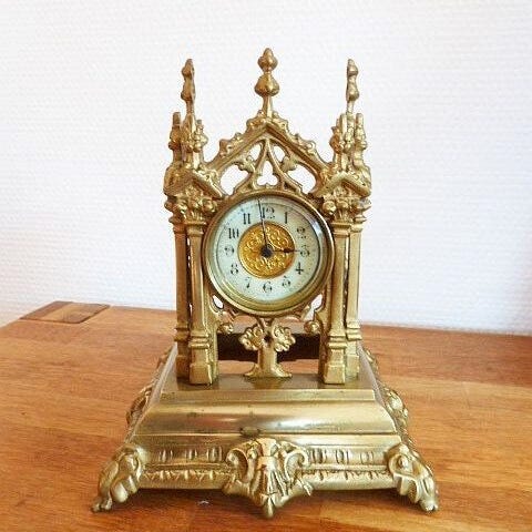 Med tydelige cifre og elegante, guldfarvede visere omgivet af en messingramme. Tidløs udstråling.