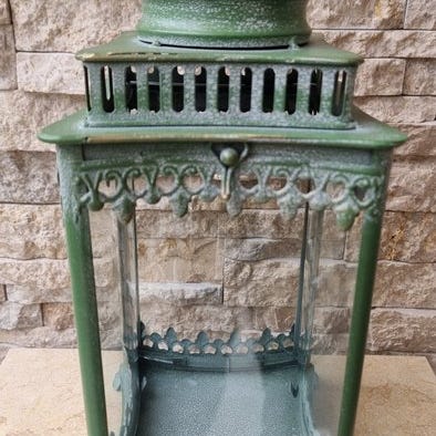 Dette er en smuk metal lanterne af høj kvalitet. Meget flot dekoreret lanterne med 12 glasruder. Denne lanterne er 80 cm høj. Lanternen giver en smuk effekt, når du tænder et tykt stearinlys i den. Målene på hele stykket er som følger: