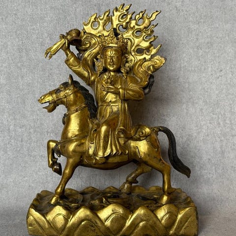 Namgyalma statue i forgyldt bronze, 31 cm høj med en base på 25 x 15 cm, vægt 3,9 kg, oprindelse Nepal, 20. århundrede, i god stand. Klik på den blå "gå til varen" knap, for at købe eller byde på denne vare. Den samlede pris vil blive vist inden du afgiver dit bud.