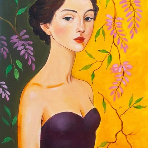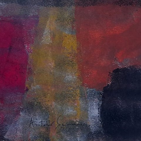 Fortryllende værk, olie på lærred på 120x100 cm af kunstneren Carla Horat (1938), med titlen I Pagliacci, fra 1998, inventarnummer 28.