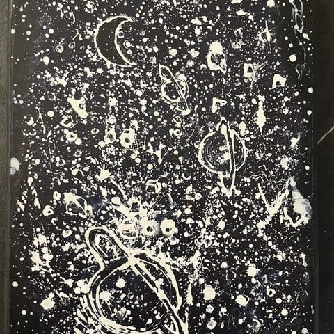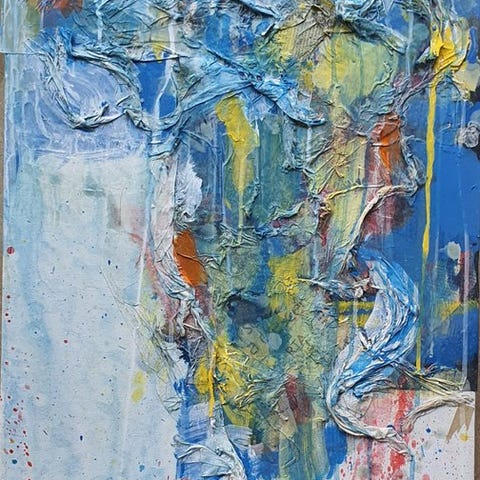 Subtile, men udtryksfulde penselstrøg skaber en følelse af dybde og bevægelse, mens tilbageholdende accenter af rød, gul, grøn og blå punkterer overfladen som følelsesmæssige fragmenter, der bryder gennem mørket. Maleriet inviterer seeren til at stoppe op og reflektere, hvilket tillader personlige minder og