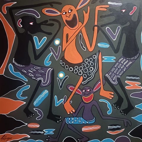 Dette er et enestående værk på lærred af den store afrikanske kunstner George Lilanga.