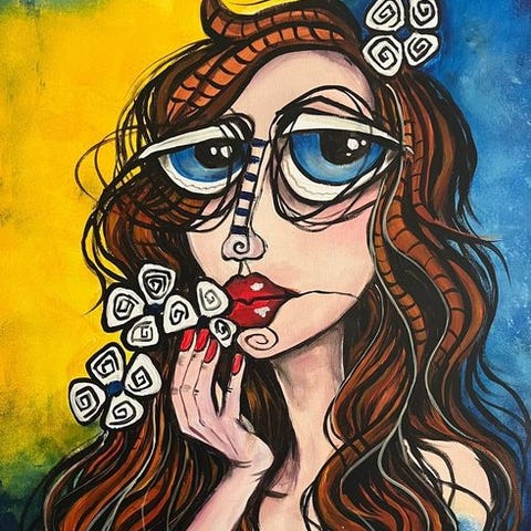 Håndmalet olie på lærred + farvede blyanter