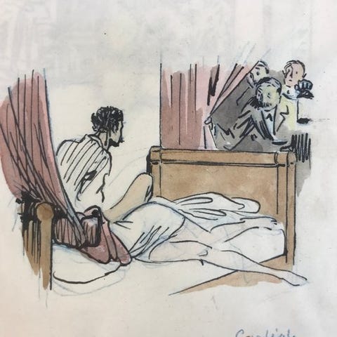 Charmerende illustreret udgave af Georges Rodenbachs roman, udgivet af Société des Médecins Bibliophiles. Forsynet med 25 akvatinter af Pierre-Adrien Bouroux (1878-1967), herunder: 1 vignette på forsiden, 3 kapiteltitler, 3 lampehoveder, 15 i teksten, 3 uden for teksten.