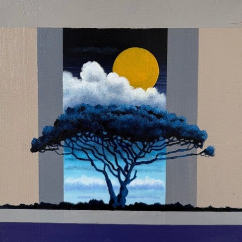 Den Røde Træ: I centrum står et majestætisk og skulpturelt træ, der rejser sig mod himlen. Dets kroner er gengivet i en intens scarlet rød, næsten