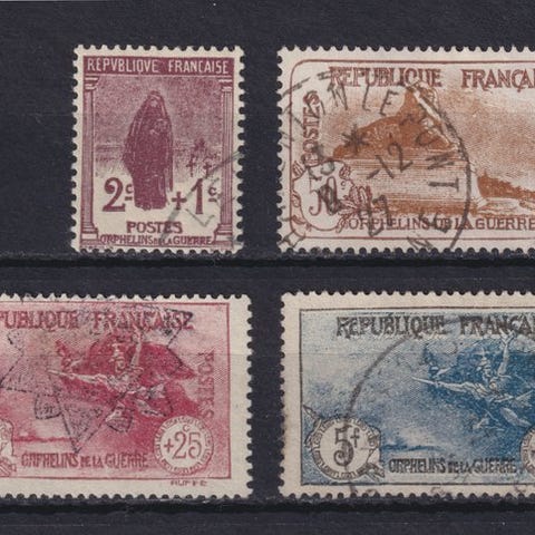 Frankrig, 5 Fr. + 5 Fr. First set Orphelins (Yvert 155), udgivet 1917–1918, ubrugt med originalt gum og et næsten usynligt hæfte-mærke. Klik på den blå "gå til varen" knap, for at købe eller byde på denne vare. Den samlede pris vil blive vist inden du afgiver dit bud.