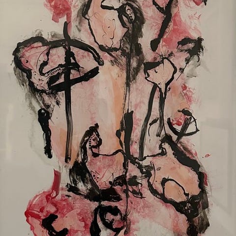 Fede sorte gestus bevæger sig over overfladen, skærer gennem livlige passager af rød, gul og blå. Disse farver er lagdelt over en dæmpet grøn bund, hvilket skaber kontrast, dybde og visuel spænding. Penselstrøget er udtryksfuldt, men kontrolleret, med synlige dryp og overlap, der giver rytme og