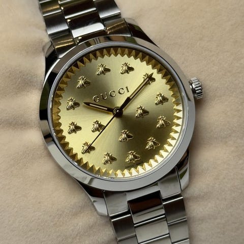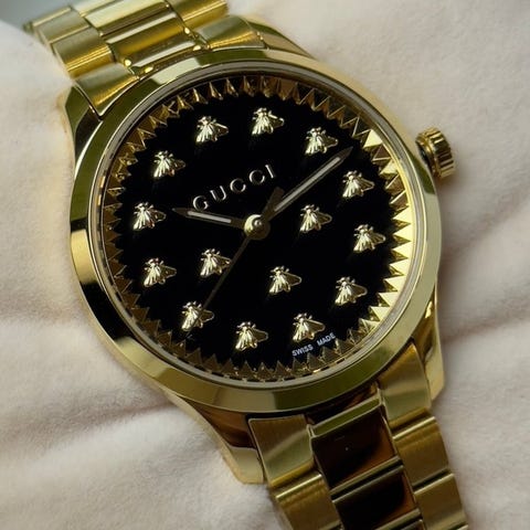 Gucci G-Timeless Multibee YA1265036, 32 mm urkasse i forgyldt stål med stålrem, schweizisk quartzværk, gyldent urskive og safirglas, dameur, nyt med original æske, papirer og garanti, forsendelse forsikret. Klik på den blå "gå til varen" knap, for at købe eller byde på denne vare. Den samlede pris vil blive vist inden du afgiver dit bud.