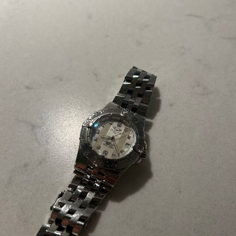Breitling Lady J-Class Black Gold Bezel, reference D52063, kvartermovement, kasse 31 mm i guld/stål, sort циферeris, læderrem, kort størrelse 160–180 mm, dametavle, år 1995, i very god stand med mindre brugsspor, forsendelse forsikret, ingen originalkasse eller papirer. Klik på den blå "gå til varen" knap, for at købe eller byde på denne vare. Den samlede pris vil blive vist inden du afgiver dit bud.