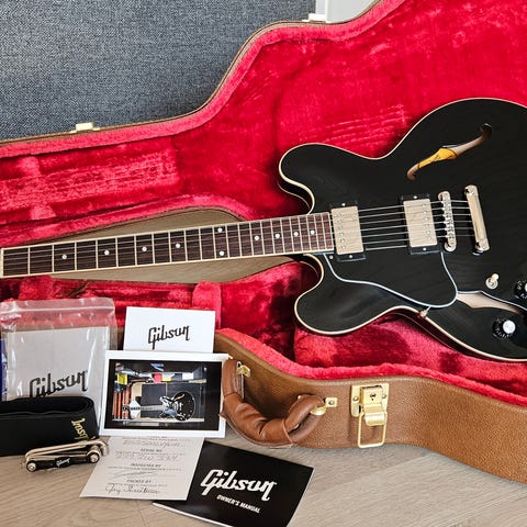 Rara semi-akustisk guitar Gibson N-225 fra 2013, serienummer 119931522 Ebony Pinstripe fra Designer Series, produceret i USA. Standardudstyret med to originale pickups: en Gibson P-90 ved halsen og en Gibson Dirty Fingers humbucker ved broen.