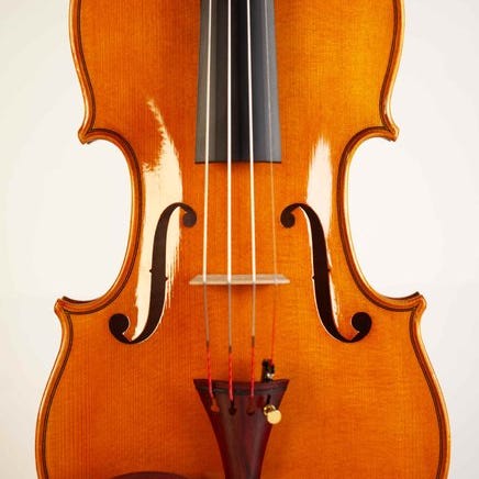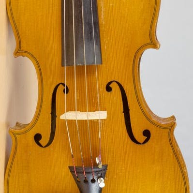 Det er en fuldstørrelsesviolin (fuld længde: 583 mm, krop: 355 mm, øvre bouts: 168 mm; midter bouts: 114 mm; nedre bouts: 206 mm) med mærkat: