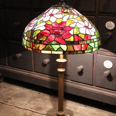 En Tiffany-stil bordslampe i blå og grøn farvet glas, Art Nouveau-inspireret, i fungerende stand leveres med lampe, mål 35 × 20 × 20 cm, vægt 1,1 kg. Klik på den blå "gå til varen" knap, for at købe eller byde på denne vare. Den samlede pris vil blive vist inden du afgiver dit bud.