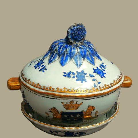 En dekorativ porcelænsterrine med låg, håndmalet, fra Kina, fra det 20. århundrede, bredde 20 cm, dybde 20 cm, højde 22 cm, med to våbenskjolde med bourbonliljer og gyldne detaljer og gylden knop i form af en liggende løve, let patina; træ fod medfølger ikke. Klik på den blå "gå til varen" knap, for at købe eller byde på denne vare. Den samlede pris vil blive vist inden du afgiver dit bud.