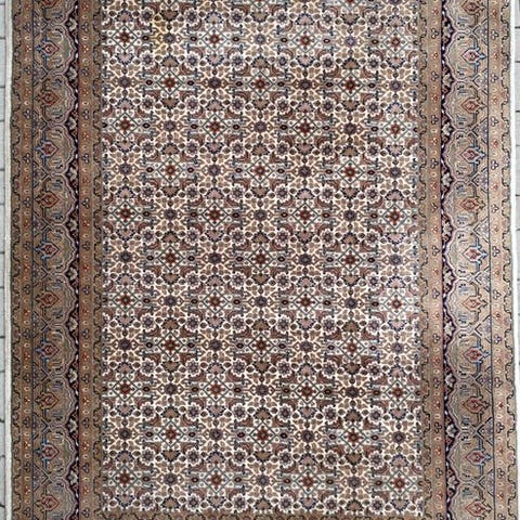 Dette er et håndknyttet østligt tæppe lavet af bæredygtige, naturlige materialer. Måden at knytte det på og mangfoldigheden i mønstrene gør dette tæppe unikt og understreger det autentiske og håndværksmæssige karakter.