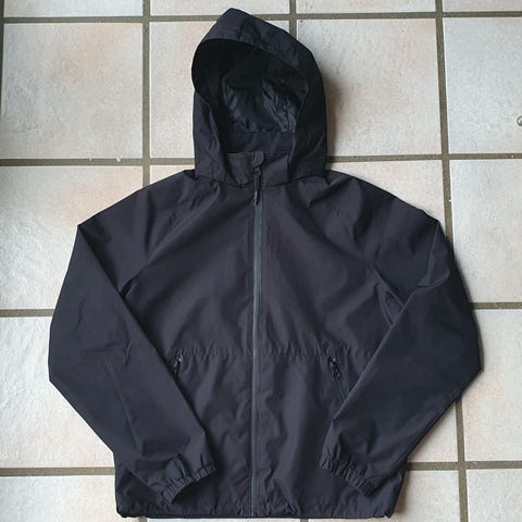 Jakke, Sommerjakke, mrk. H&M sport, str. 134, sort, uden foer, med hætte, lommer foran, kr. 25,00.