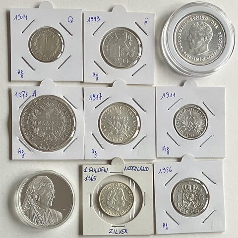 Sæt med 9 udvalgte sølvmønter fra Schweiz.