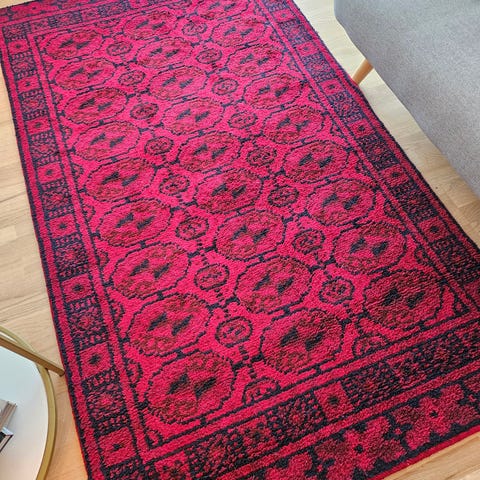 Afghansk vintage Ersari vægteppe, håndknyttet i uld på bomuld, størrelse 68 x 72 cm, generelt i god stand med aldrings- og brugsspor, professionelt renset. Klik på den blå "gå til varen" knap, for at købe eller byde på denne vare. Den samlede pris vil blive vist inden du afgiver dit bud.