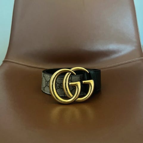 Pas Gucci, model GG Marmont, lavet af lyserødt læder og GG jacquard stof i beige nuancer med monogram i samme tone. Lukning med en guldbelagt, skinnende metalspænde Double G. Næsten perfekt stand. Ikonisk og alsidig, perfekt til hverdagsstile eller mere elegante sæt. Angivet størrelse 80. Total længde 90 cm, højde 4 cm.