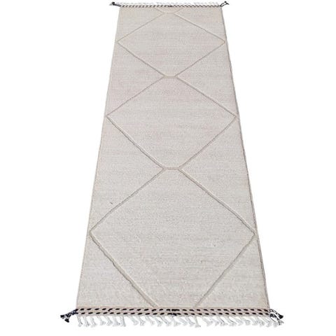 Et stilfuldt håndknyttet Berber-tæppe, inspireret af den tidløse skønhed i traditionelle nomadetæpper. Det enkle rudemønster på naturhvid baggrund udstråler elegance, autenticitet og håndværksmæssig præcision – perfekt til moderne og klassiske opholdsrum.