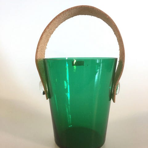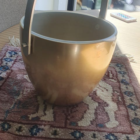Retro isspand i aluminium fra Kløverblad. Fra sidst i 1960erne, designet af Erik Herløw i 1956. Hanken er omviklet af sort plast. Indsatsen er af plast med huller i bunden, så isterningerne kan holde længere. Produceret af Dansk Aluminiums Industri. I meget fin stand. H 12 cm., H med hank 21 cm. og Ø 14 cm.