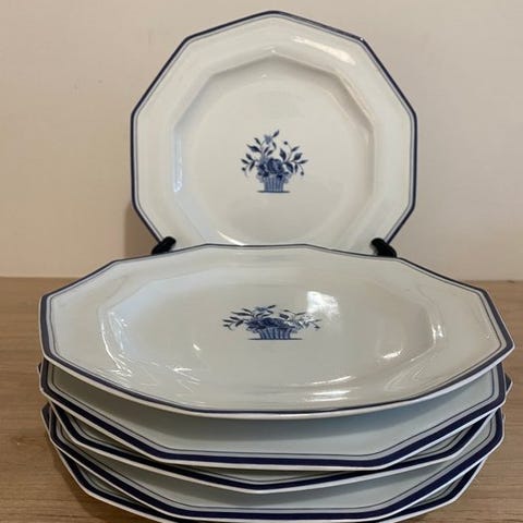 Vi har 12 tallerkener med fjerklædte vildtdesigns i et landligt univers, der viser spor af udviskninger af de indre randzoner på nogle steder, som på billederne, med en diameter på 23,5 cm.