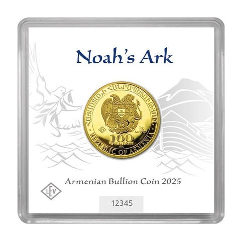 1/4 oz guldmønter 'Noah's Ark', fineness 0,999, raffinatoriet 2025 - Noah's Ark fine gold, oprindelse Armenien. Klik på den blå "gå til varen" knap, for at købe eller byde på denne vare. Den samlede pris vil blive vist inden du afgiver dit bud.