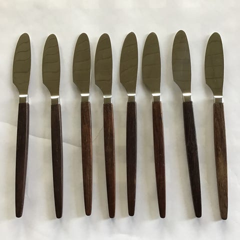 Stand: I fremragende stand med minimale tegn på slid. Knivene er polerede, mens metalhåndtagene har en smuk, blank sølvbelægning.