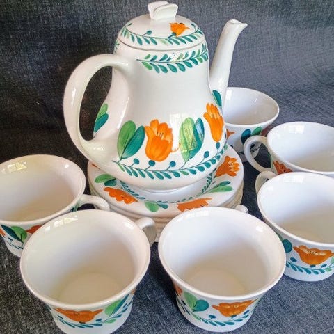 Raffineret og livligt service til bordet fra Richard Ginori, italiensk manufaktur i topklasse, med typisk modernistisk blomsterdekoration i nuancer af turkis og citron-gult.