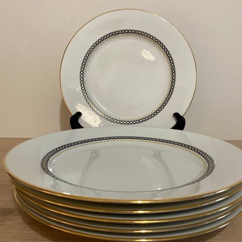 2 flade tallerkener, 24,5 cm, lille grekisk mønster med emblem.