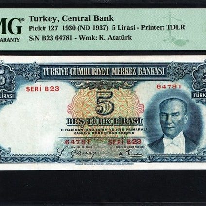 Tyrkiet 100 Liras 1930 (ND 1947) med et billede af præsident Mustafa İsmet İnönü; bagsiden: Rumeli-fortet ved Bosporus; PMG Very Fine 30; certificeret 1918974-012. Klik på den blå "gå til varen" knap, for at købe eller byde på denne vare. Den samlede pris vil blive vist inden du afgiver dit bud.