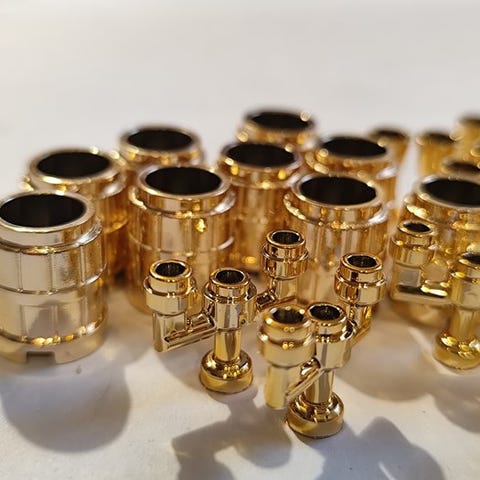 300 kromerede LEGO-klodser (150 kromguld og 150 kromsølv) til et tilpasset slot-/pirat-sæt, nye i forseglet emballage, lavet i Danmark af LEGO. Klik på den blå "gå til varen" knap, for at købe eller byde på denne vare. Den samlede pris vil blive vist inden du afgiver dit bud.