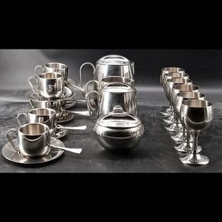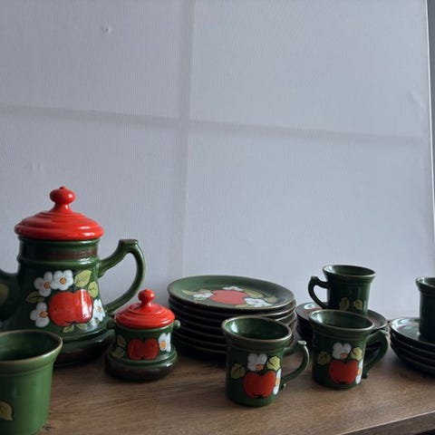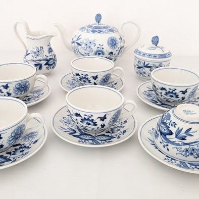 Sættet er ubrugt og i fremragende stand, men en desserttallerken er klistret fast.